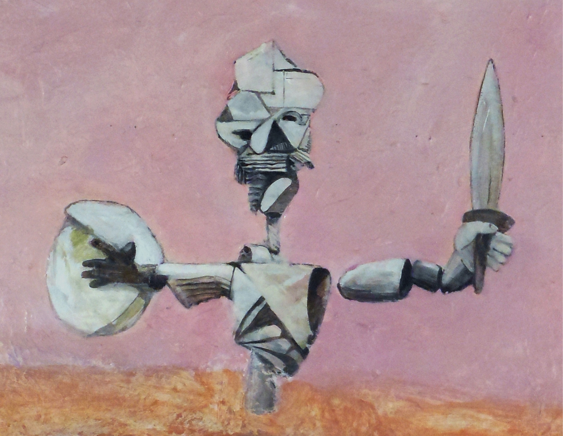With his lance at the ready and his shield in place he assumes the stance of hero, but as we know, he’s not good at it. He is anything but threatening and doesn’t even seem able to protect himself, with his arms wide open in a gesture of welcome as opposed to attack mode.