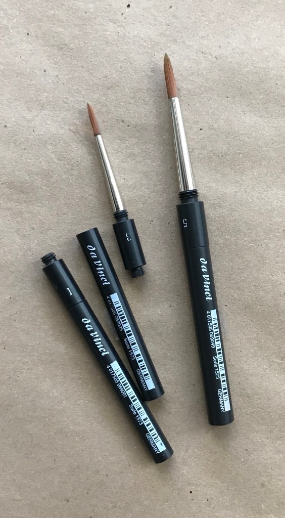 The mechanical pencils and stump I use for drawing in the sketchbooks, but for laying in the drawing that I’m going to paint over, I use the #2H and #3H pencils because they are so light they kind of disappear in the paint. But my favorite thing in my bag is the set of 3 collapsible daVinci brushes: