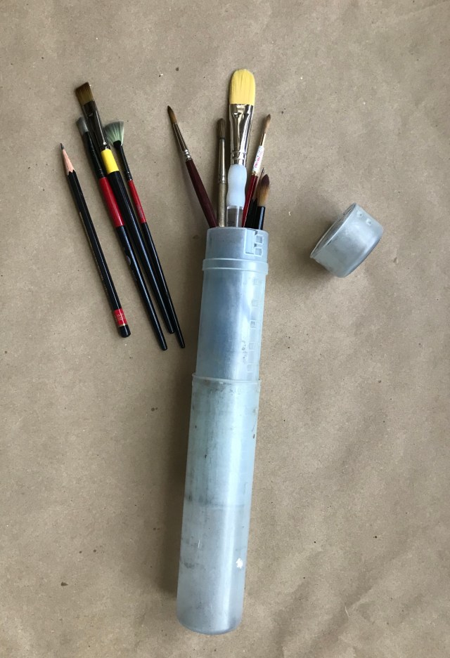 I take a small variety of brushes: #10, #6, #4 rounds; 1/2″ and #12 flats, a fan brush and a 2H and a 3H pencil.