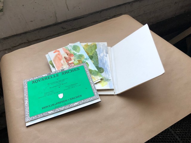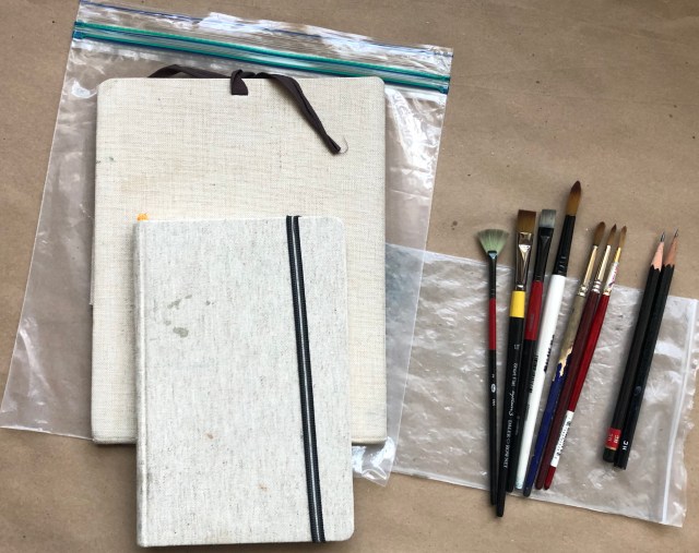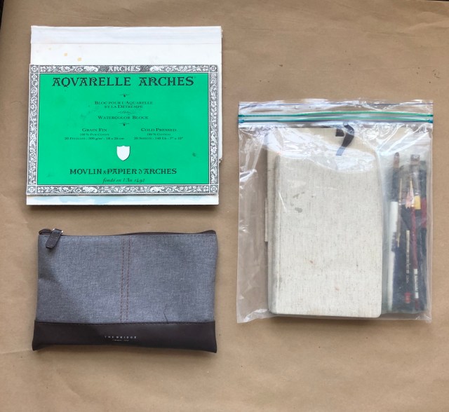 The block of Arches WC paper -140 lb; 7″ x 10″ – and a styrofoam portfolio that doubles as a backing board don’t fit into the zip lock, but travel well enough on their own, although sometimes I use a big rubber band to hold them together.
